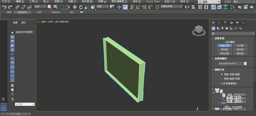 5、选择其中的一个窗,然后在左边的空白处点击鼠标左键,进行长度,宽度,高度的一系列设定,这样就会出现这个遮蓬式窗